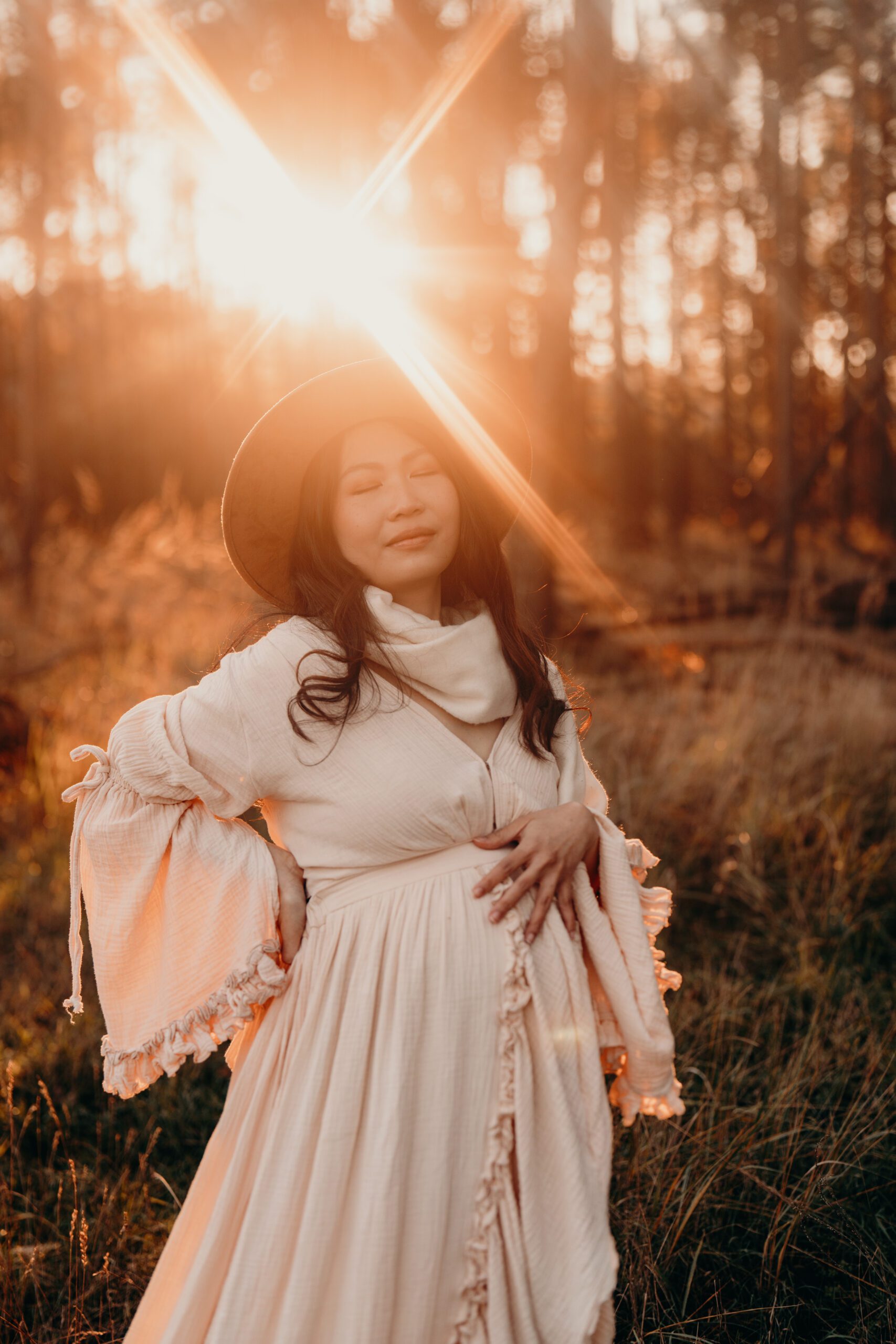 Frau mit Hut im Boho-Kleid im Sonnenuntergang